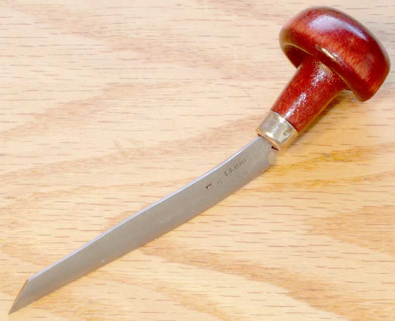 Tool has curved sides that come to a point at the cutting edge. Makes a line varied in width from top to bottom. Used on wood & metal. Made of high carbon tool steel.